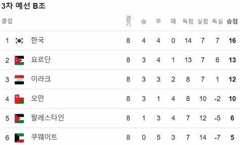 뒤를 이어 요르단 13점, 이라크 12점으로 대한민국을 쫓고 있습니다. 남은 경기의 승패가 중요하겠죠.
